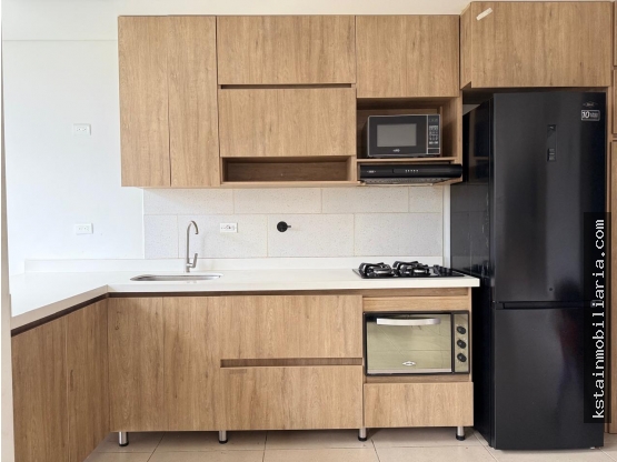 tiene un área de 37 mts aprox, cuenta con 1 habitación, 1 baño, cocina integral, red de gas, calentador, aire acondicionado, nevera, tv, horno, aspiradora, cortinas black out, muebles para tv, base cama colchón ortopédico, sofá cama, 2 sillas de barra, chapa digital, sala comedor y zona de ropas. NO TIENE PARQUEADERO.